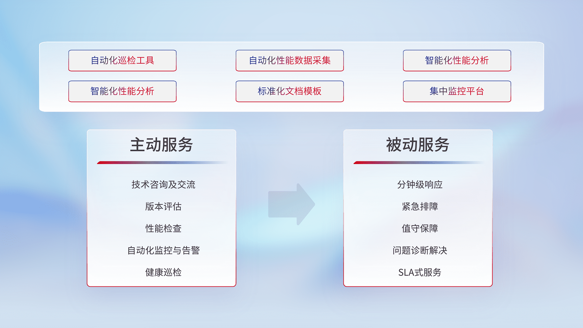 智能化工具和标准化文档,,,保障服务质量,,,,提供主动服务(包含技术咨询、、、、版本评估、、、性能检查、、、、自动化监控与告警、、健康巡检)和被动服务包含(分钟级响应、、紧急排障、、、值守保障、、问题诊断解决、、、、SLA服务)。。。