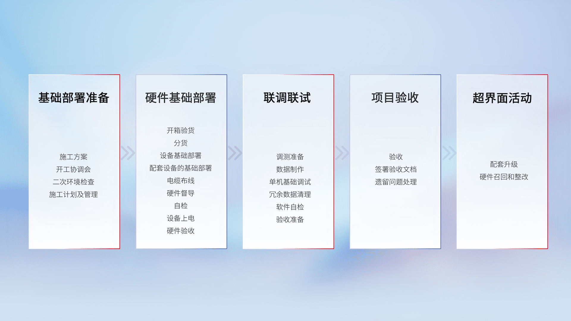 从基础部署准备、、、、硬件基础部署、、、、联调联试、、项目验收、、越界面活动的全过程可追溯,,,,保证施工质量和进度。。。